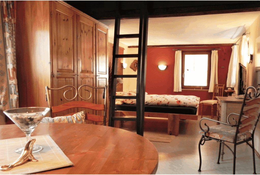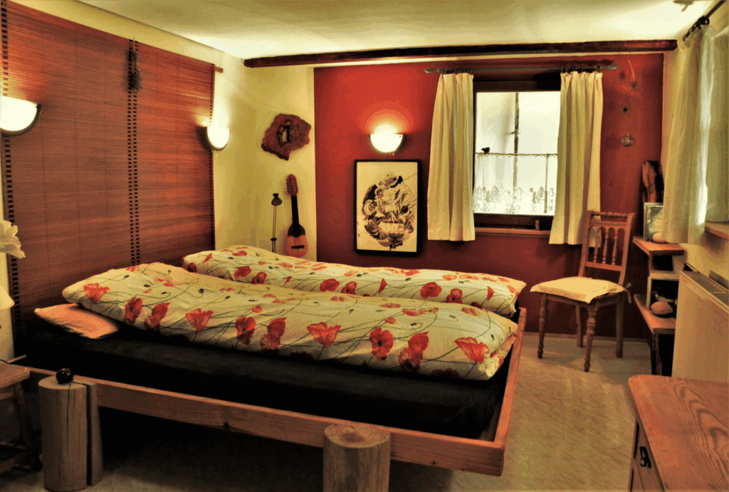 Gemütlich wohnen: Unser urgemütliches Gästehäuschen mit 35 m² Wohnfläche ist ideal für 2 Personen. Für eine 3. Person gibt es zusätzlich ein kleines Räuberbett im Giebel.